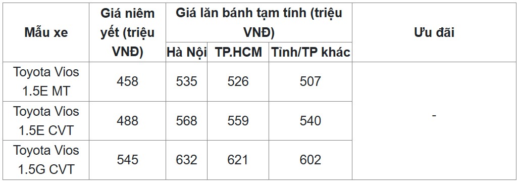 Giá Xe Lăn Bánh Toyota Vios Tháng 5/2025