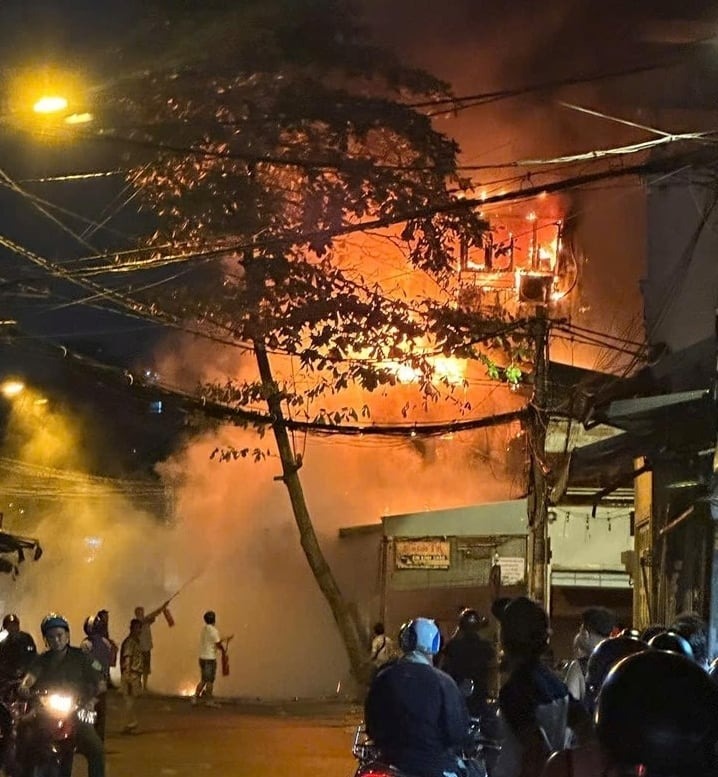 Ngọn lửa sau đó bùng lên dữ dội bao trùm các phòng từ lầu một lên lầu ba lan sang đường dây điện ở phía trước, đỏ rực một góc đường.